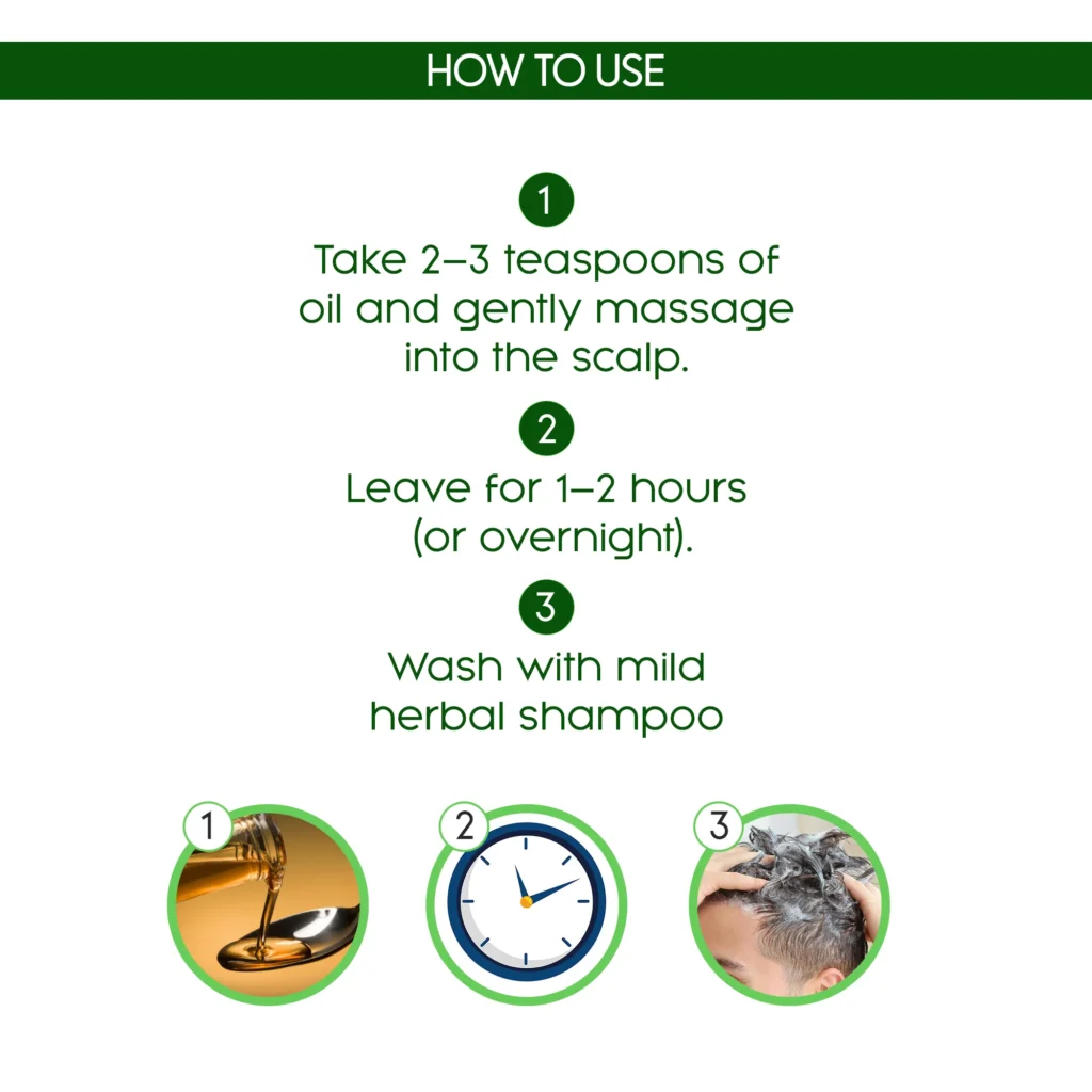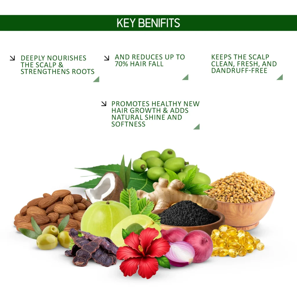 A premium blend of herbal ingredients including Amla, Bhringraj, Bahera, Onion, Kalonji, Methi, Ginger, Neem, Moringa, Natural Green Herbs and Vitamin E.